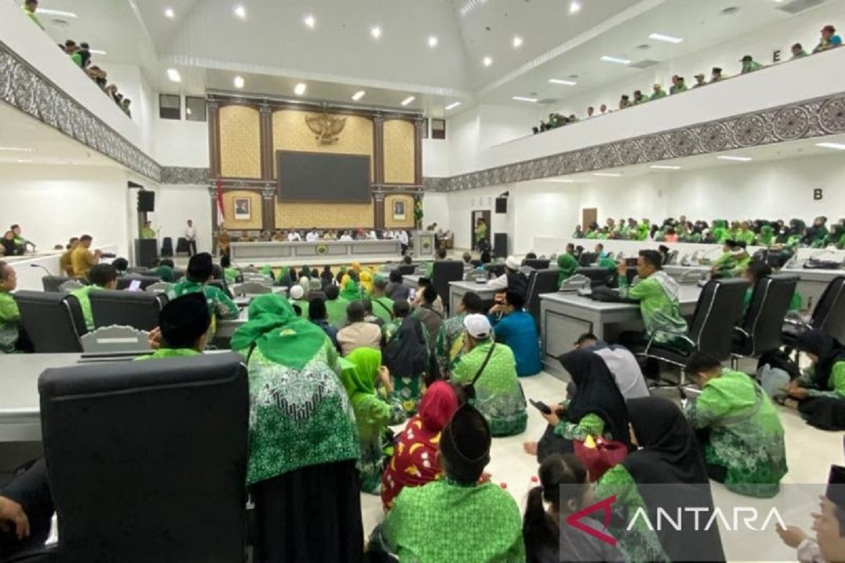 Ribuan guru madrasah melakukan audiensi dengan anggota DPRD Kabupaten Cianjur, sebelumnya mereka sempat menggelar aksi unjukrasa damai menuntut kesamaan hak, Senin, 6/10/2025.-Foto: net-