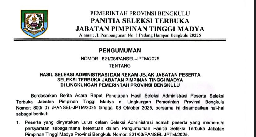 Panitia Seleksi (Pansel) Selter JPTM Sekdaprov Bengkulu mengumumkan hasil seleksi administrasi yang menetapkan delapan peserta lolos, dari total sepuluh pelamar yang mendaftar.