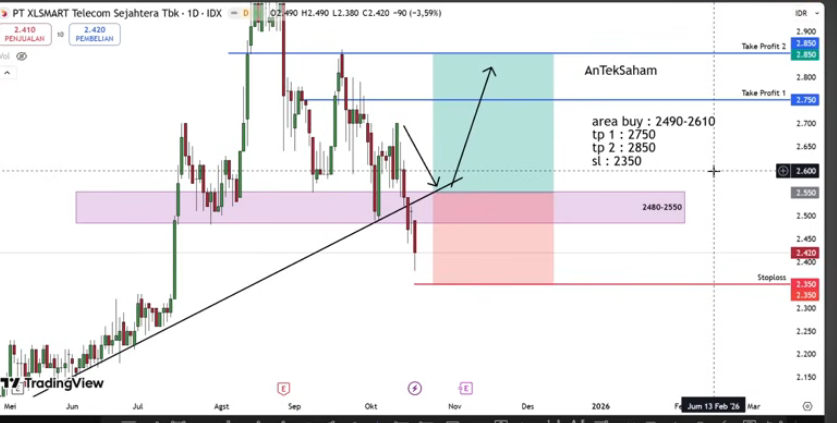 Saham EXCL mengalami pelemahan seiring dengan koreksi IHSG. Saham ini breakdown dari area support dan demand zone, sehingga potensi besar terkena stop loss di level 2.350.