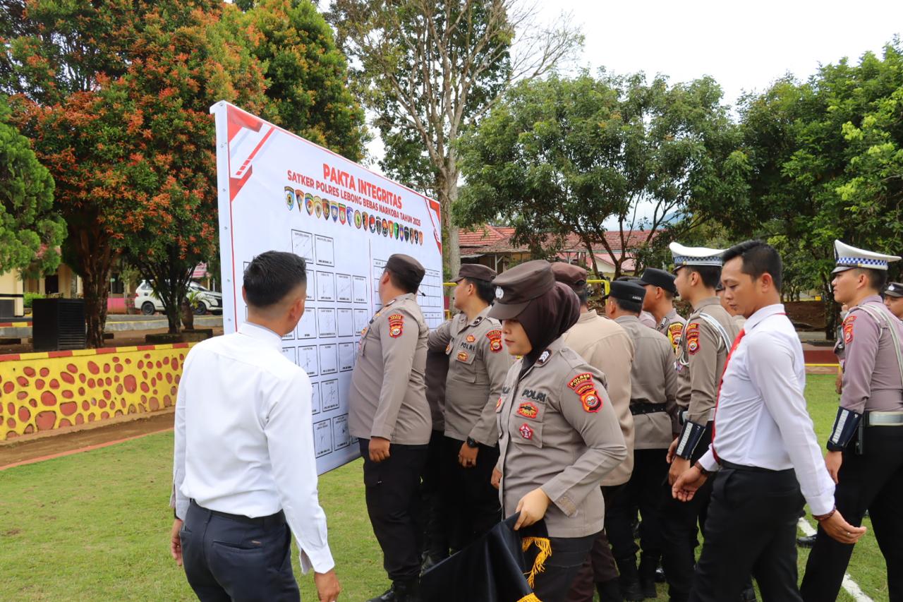 Setelah pembacaan komitmen, kegiatan dilanjutkan dengan penandatanganan pakta integritas oleh seluruh anggota, sebagai bentuk tertulis dari keseriusan Polres Lebong dalam menciptakan lingkungan kerja yang bersih dari narkoba.