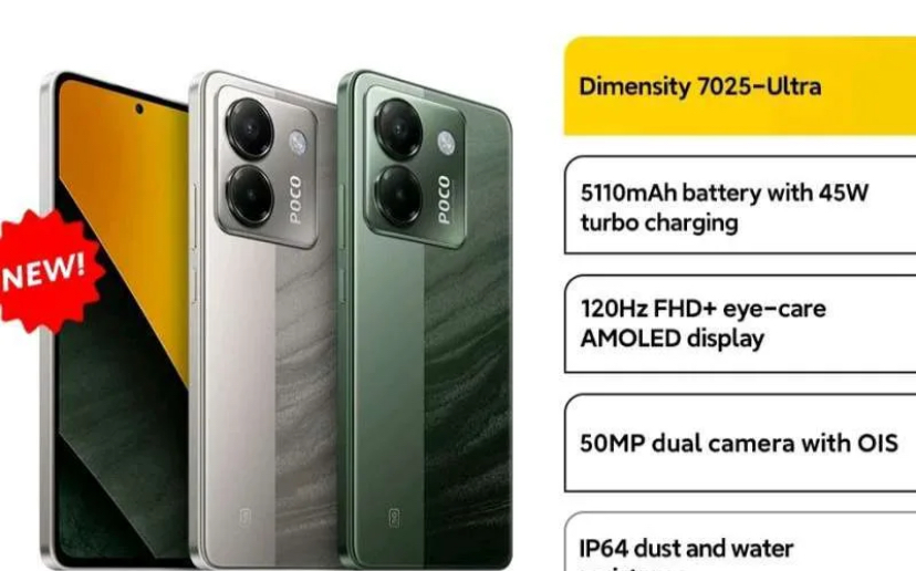 Poco M7 mengandalkan prosesor Snapdragon 685 yang menawarkan performa lebih cepat dibandingkan seri sebelumnya. Daya baterainya sangat unggul di kelas menengah yaitu 7000mAh dengan dukungan pengisian cepat 33 watt. Varian terbaiknya adalah RAM 8GB dan memori internal 256GB dengan harga Rp2,1 jutaan. Ponsel ini menjadi pilihan ideal bagi pengguna yang membutuhkan daya tahan baterai lama, cocok untuk gaming ringan hingga menengah. Model ini menawarkan konektivitas 5G dengan chipset MediaTek Dimensity 7025 Ultra. Baterainya memiliki kapasitas 5110mAh dengan pengisian cepat 45 watt. Poco M7 Pro juga unggul dengan sertifikasi IP64 yang menjamin ketahanan terhadap cipratan air dan debu. Kamera 50MP-nya mampu memberikan hasil foto yang detail. Varian RAM 8GB dan penyimpanan 256GB dijual dengan harga Rp2,8 jutaan, menjadikannya opsi menarik di segmen 5G harga terjangkau.